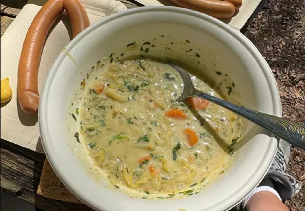 Die Mittagspause verbringen Sie am Feuer mit einer hausgemachten vegetarischen Gerstensuppe.